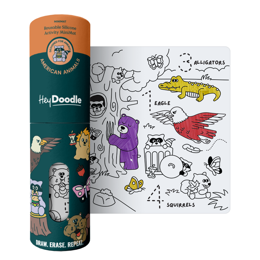 Product Description: Perfectly sized for on-the-go fun, the American Animals MiniMat introduces kids to some of America’s most beloved wildlife while practicing numbers 1–10. With a compact, reusable silicone surface, children can color, trace, and count their way through iconic animals like the bald eagle, bison, and raccoon. Once they’re done, simply wipe clean with a damp cloth, ready to start all over again! A bite-sized version of our Classic Mats, the MiniMat includes three markers packaged in a beautiful gift tube, making learning fun, hands-on, and easy to take anywhere.