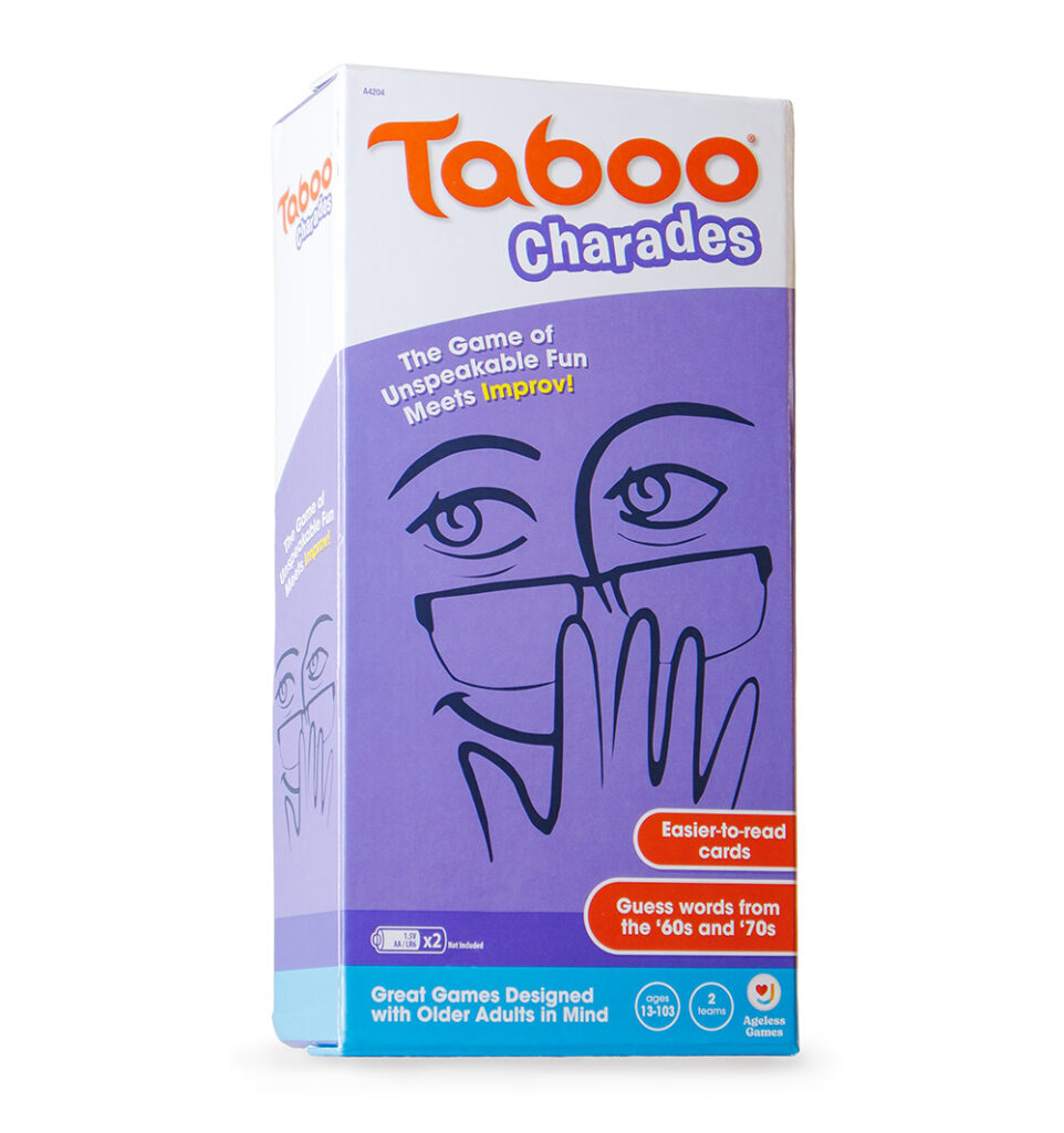 Product Description: TABOO Charades offers unspeakable fun for older adults, bringing players classic word guessing fun with a senior-friendly twist. Designed with older adults in mind, this simple card game encourages players to act, guess, and laugh together. With nostalgic words from the ‘60s and ‘70s, it’s easy to relate to, making it a hit for those seeking engaging and lively group activities. Designed to be more fun and accessible for aging loved ones, TABOO Charades features bigger, bolder text for effortless reading. The charades component is a unique twist on the classic game, and encourages light physical activity to enhance game nights. The best part? TABOO Charades offers a customizable experience so that all players can make it their own.