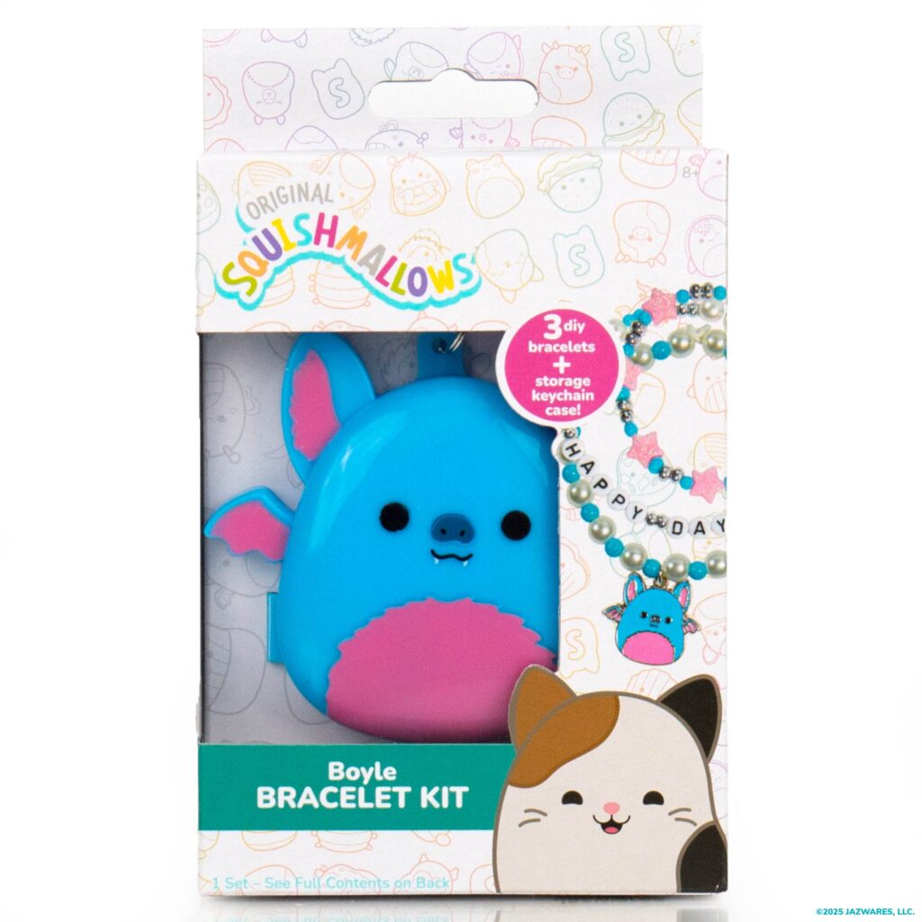 Product Description: Make custom bracelets that are beyond boo-tiful with the Original Squishmallows™ Boyle the Bat Bracelet Kit! Packed with plenty of beads in Boyle’s favorite colors and 5 bundles of cording, you can create 3 custom bracelets to stack or trade. String up fun patterns with pearls, pink glitter stars, and colorful round beads, then add the metallic alphabet beads that spell HAPPY DAY for a dash of playfulness — don’t forget to incorporate the Boyle charm to show off your ’Mallow pride! Ideal for beginners and pros alike, this kit comes with a fun project guide that’ll ensure your designs are a hit whether you are traveling with friends, braving a haunted house, or on a solo adventure! And with a bonus Boyle keychain to accessorize anything from backpacks to purses and gym bags, you can Squad Up wherever you go! This set is perfect for any Squishmallows fans age 6 and up.