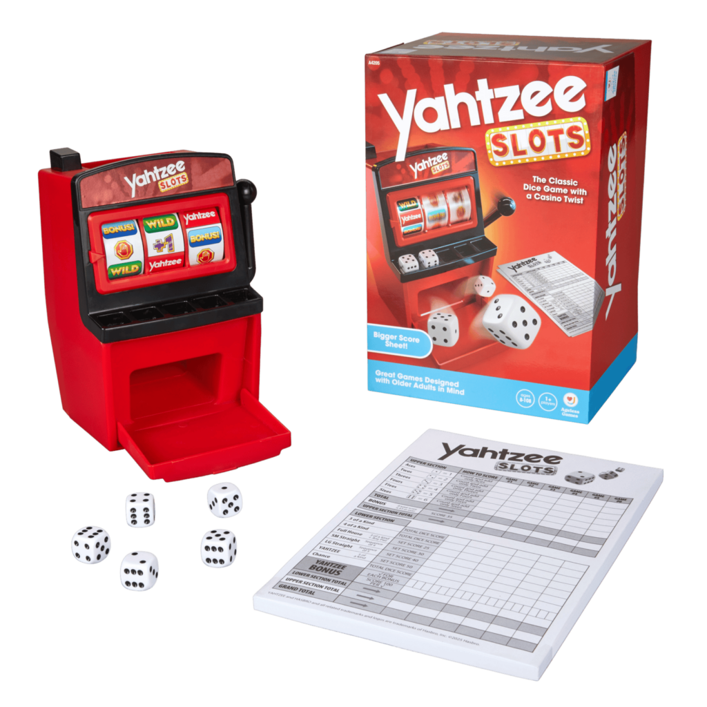Product Description: Yahtzee Slots is the classic dice game with a CASINO TWIST! Take a trip to the casino without leaving the house. Specifically designed to bring fun to older adults, this game includes oversized score sheets and rules with larger, easier to read text. Play the standard game of Yahtzee with the added fun of slots! Spin for extra Yahtzee’s, bonus rolls, and more! Play features include tabletop slot machine—super fun to spin, and a friends & family game log that allows players to keep track of the fun times shared. The game also includes 3 ways to play—Yahtzee Slots, Classic Yahtzee, and a fun, quick game called Dice Drop. Do you feel lucky?