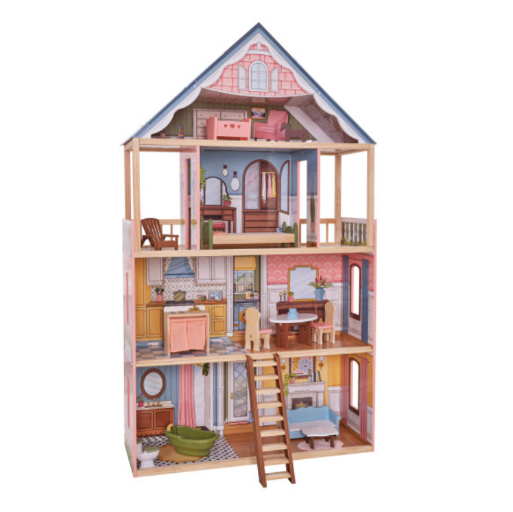 Product Description: The charming KidKraft Charlotte Dollhouse has gotten a makeover with a new triangular roofline, fresh graphics, soothing color palette and updated furnishings. Standing over four feet tall with four levels of dreamy play, this beautiful wooden dollhouse offers lots of space so multiple kids can explore and play at the same time. There are four levels, six rooms (including a hidden bonus room), two balconies, and open windows and doorways for easy role playing. A 15-piece furniture set (including a removable stairway) encourages imaginative stories and creative design as kids play with their 12″ dolls. This timeless dollhouse is made of wood so you can keep it around to pass down from kid to kid. The streamlined silhouette makes it a stunning centerpiece in a bedroom, playroom or even living area.ore!