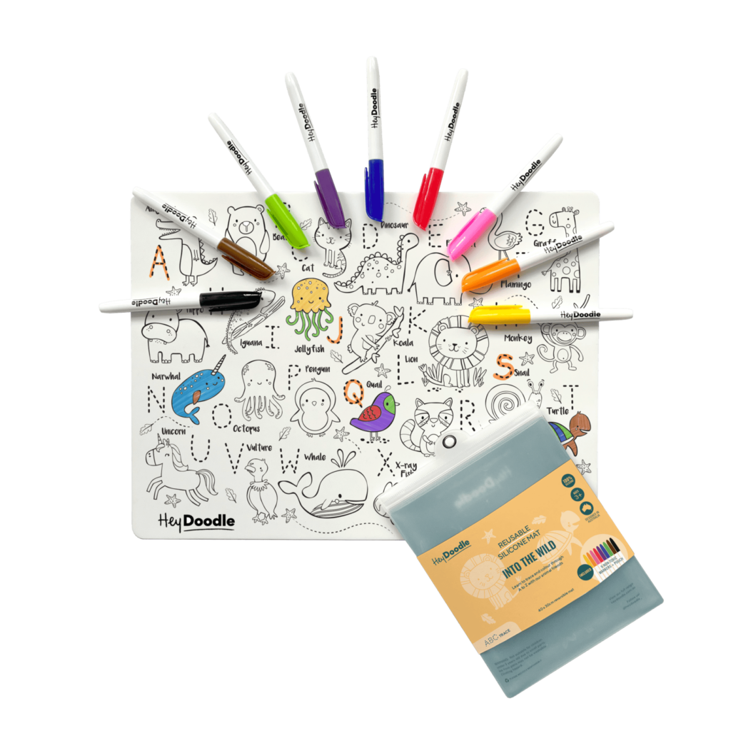 Product Description: HeyDoodle silicone mats introduce a new canvas to the arts & crafts industry. Printed on premium grade silicone, the reusable coloring mats come in a range of themes and activities to engage curious minds. With “Into the Wild,” practice writing the alphabet while learning the names of our furry, feathered, and slimy friends or see how many blowing leaves and shiny starfish you can find! Best thing is, as with all HeyDoodle mats, they can be wiped clean and reused! Includes 9 non-toxic markers and a handy carry case ready to go with you. Easily wiped clean with a damp cloth. Age Range: 6+
