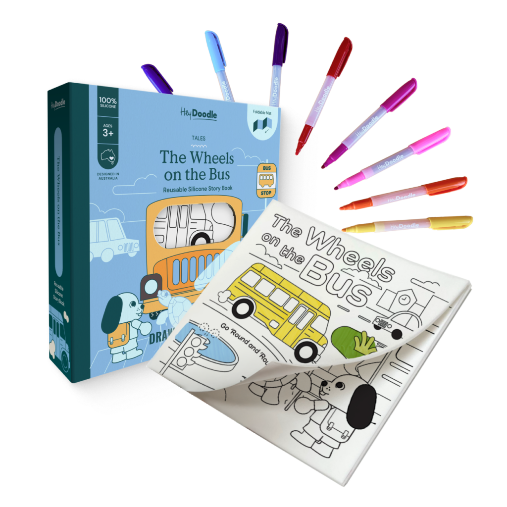Product Description: Hop on board the Wheels on the Bus in this wipe-clean, reusable activity book from HeyDoodle! Ideal for early learners, this interactive story lets children trace, color, and sing along while developing key fine motor and counting skills. With familiar lyrics, traceable motions, and playful illustrations, this educational story book offers screen-free fun that supports preschool learning and creativity on the go. Lightweight and eco-friendly, it’s ideal for on-the-go learning, quiet play, or enriching any Montessori-inspired home or classroom. The silicone book’s flip pages can stretch out and fold down to store away into its beautiful keepsake box, and includes 12 markers.