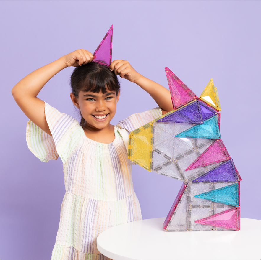 Product Description: For unicorn lovers, fantasy dreamers, and creative explorers, this pack is filled with delightful play possibilities. Featuring a stunning combination of glitter magnetic tiles in dazzling clear and bright rainbow colors of pink, yellow, teal, and purple, plus a thoughtful selection of shapes in squares, hexagons, rectangles, triangles, and trapezoids to bring your sparkly unicorn creation to life! Each tile features multi-colored sparkles and a unique bevel design to enhance every build and illuminate STEAM learning possibilities. Inspire birthday party decorations, castles, animals, snow globes, and more!