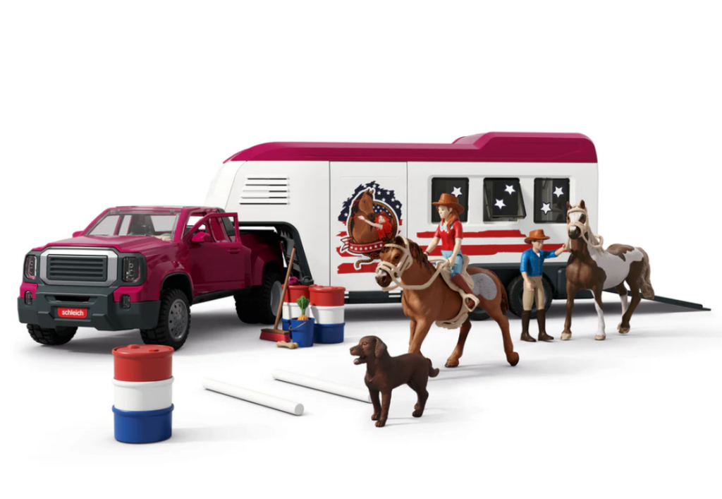 Product Description: The great Lakeside Truck with its large trailer is back on the road. Hannah and Mr. Kramer can’t wait: They are heading to a Western adventure with the Quarter Horse Stallion and the Paint Horse Gelding. In the morning, they loaded the great Dually Truck with its wide twin tires with saddles, bridle, curry comb, grooming brush, bucket and water hose so that they could clean their two horses before the event. They packed the cowboy hats for themselves. They will take a break along the way. How practical that the roof of the trailer can also be used as a shelter. Hannah has also packed a few barrels with bars. She has scheduled a training session before the Western adventure. The labrador retriever is also on board. There is plenty of space for them in the trailer. It can transport up to five horses! Yee-haw – Western adventures here we come!