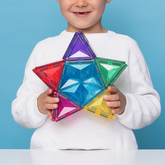 Product Description: Light up your play with the Light Star Pack! Featuring pentagons, squares and equilateral triangles in all eight bright colors, plus a rechargeable light-up magnetic tile designed to transform construction play into a wonder-filled light show! Watch as children learn about color mixing, refractions, shadows and optical illusions as they experiment with the direction and the intensity of light. Simply light up one or both sides of the tile and engage in one of three dimming settings to take light exploration and magnetic tile play to the next level! Bursting with STEAM learning potential, children can build their very own star, houses, animals, Ferris Wheels, 3D shapes and so much more
